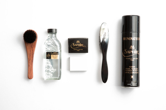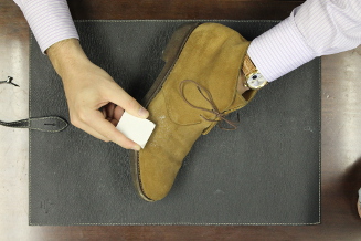 Za pomocą Saphir Metal (szczoteczki do zamszu) usuwamy kurz i powierzchowny brud. Następnie za pomocą Saphir Gommadin (gumka do zamszu i nubuku) usuwamy suche plamy i zabrudzenia, z którymi nie poradziła sobie szczoteczka.