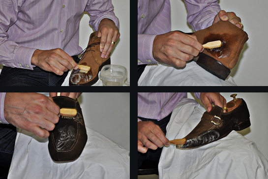 Kiedy skóra jest sucha szczotkujemy ją specjalną szczotką do zamszu - Saphir Metal. Struktura skóry po tym zabiegu ponownie robi się meszkowata i miękka. Szczotkując staramy się nieco postawić włoski, by ułatwić jak najdokładniejszą regenerację koloru, za pomocą pigmentów zawartych w Saphir Suede Renovetine.